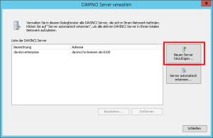 Beim erstmaligem Start der Software sind keine Server-Informationen hinterlegt. Über die markierten Schaltflächen lässt sich ein neuer Server hinzufügen.