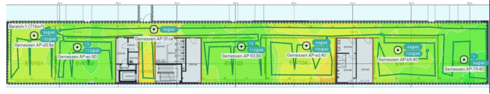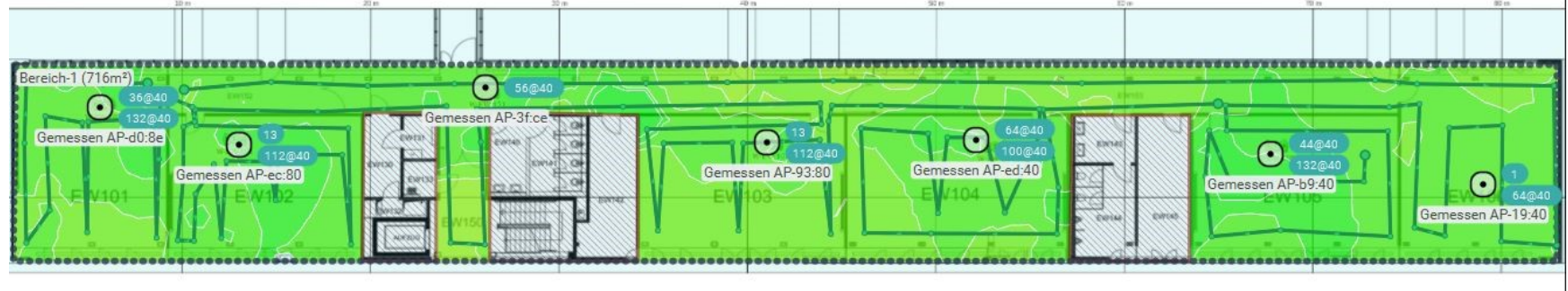 Hier werden die Messergebnisse zum Gebäude EW an der Werderstraße gezeigt. Grün bedeutet gute WLAN Verfügbarkeit, gelb steht für ein schwächeres Signal. Diese Bilder dienen als Orientierung für den interessierten Nutzer. Sie wurden in Rahmen einer Messung im Dezember 2023 an der Werderstraße angefertigt.