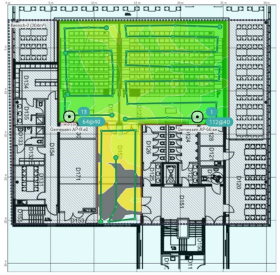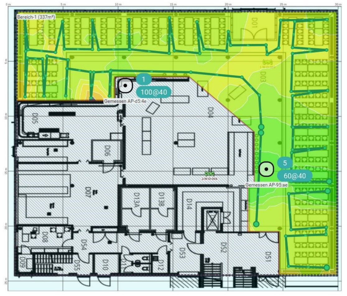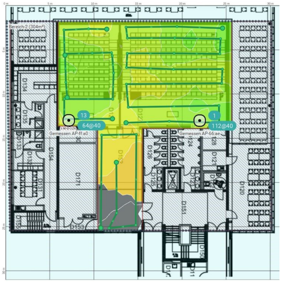 Hier werden die Messergebnisse zum Gebäude Mensa an der Werderstraße gezeigt. Grün bedeutet gute WLAN Verfügbarkeit, gelb steht für ein schwächeres Signal. Diese Bilder dienen als Orientierung für den interessierten Nutzer. Sie wurden in Rahmen einer Messung im Dezember 2023 an der Werderstraße angefertigt.